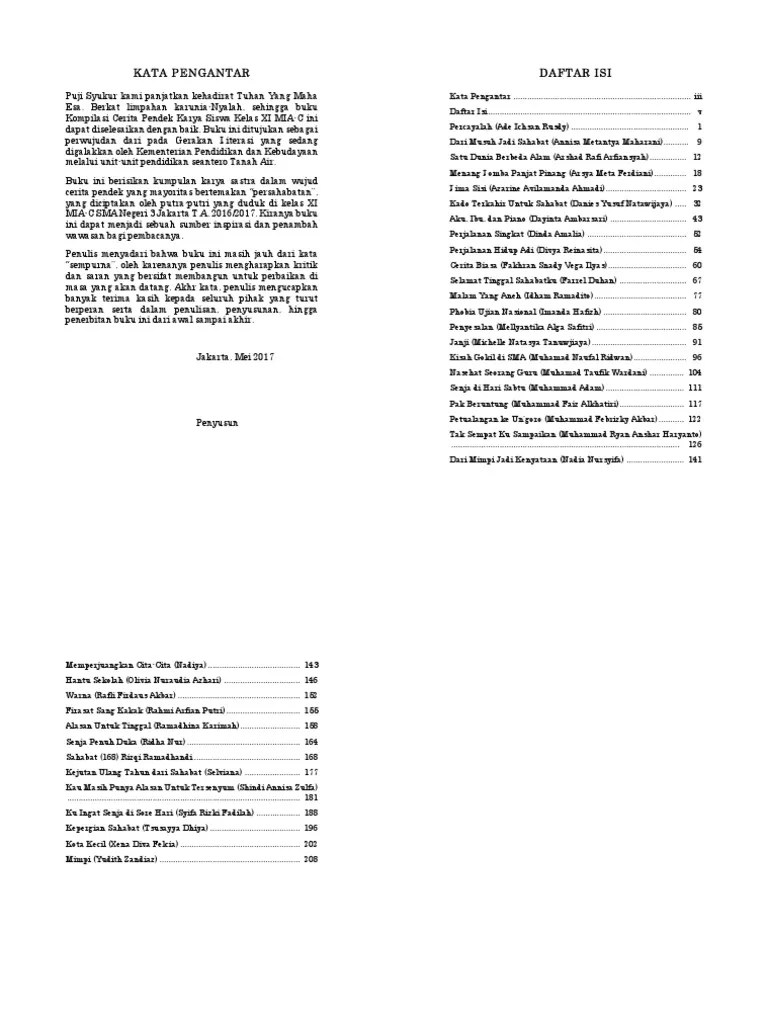 Antologi cerpen berarti buku yang isinya kumpulan karya cerpen dari seorang atau beberapa orang penulis. Contoh kata pengantar untuk cerpen dikdasmen. Buku antologi puisi ini disusun berdasarkan ide dari dari para tweeps sahabat @bait_puisi di twitter, yang dikumpulkan/dihimpun oleh admin @bait. Apakah cerpen merupakan kumpulan cerpen? 10 contoh kalimat repetisi dalam bahasa indonesia 12 contoh majas paradoks dalam kalimat bahasa indonesia Oct 25, 2020 · contoh kata pengantar novel. Siapa kata pengantar antologi cerpen dalam bahasa indonesia? Contoh kata pengantar antologi cerpen dalam bahasa indonesia.beberapa contoh kata pengantar yang telah kita lihat di artikel sebelumnya. Contoh {1} puji kami atas kehadiran tuhan yang mahakuasa. May 02, 2018 · contoh kata pengantar antologi cerpen dalam bahasa indoneria merupakan contoh kata pengantar yang ada di halaman awal sebuah buku antologi cerpen. Jual buku jejak jiwa antologi cerpen anak anak katolik oleh veronica um kusrini gramedia. Mar 04, 2013 · kata pengantar puji syukur kami panjatkan kehadirat tuhan yang maha esa. Dalam mempersiapkan antologi cerpen anak muda, penulis berusaha semaksimal mungkin sesuai dengan kemampuan penulis.